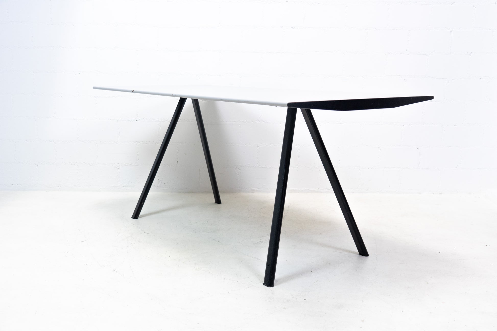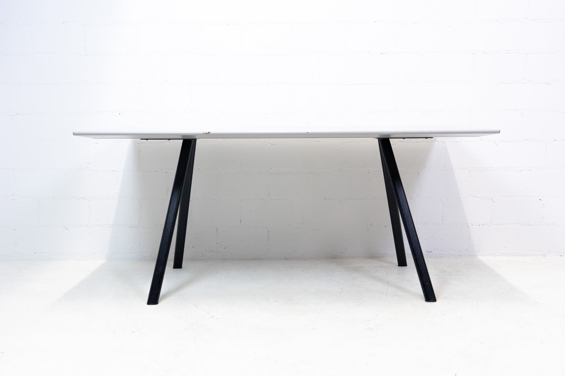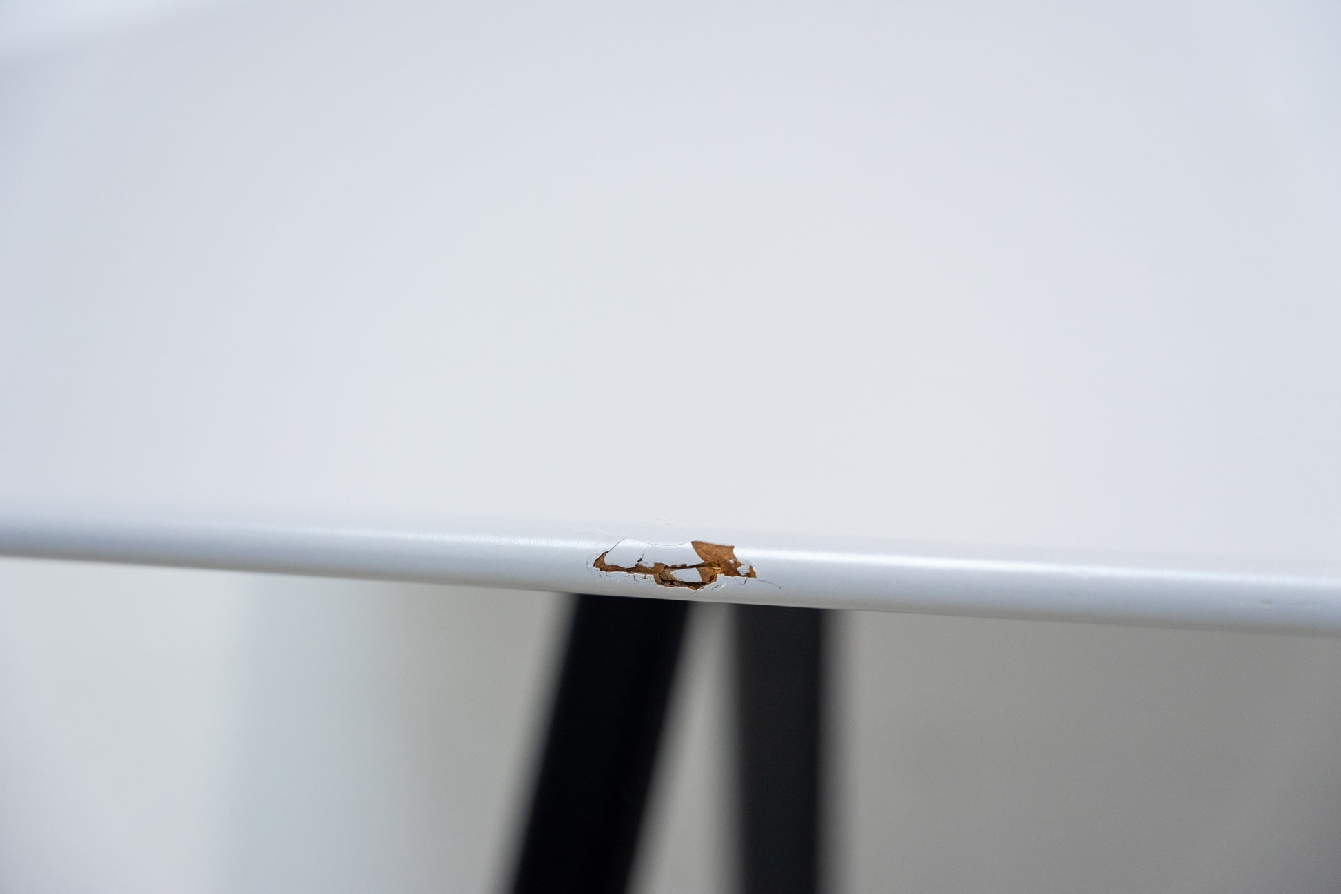 Der Tisch ist qualitativ hochwertig gebaut. Es hat stellenweise Gebrauchsspuren in Form von Abschürfungen, Kratzern und Verfärbungen. An einer Kante hat es eine Beschädigung. Wir haben davon Detailfotos gemacht. Ansonsten ist der Tisch noch gut erhalten. Das Design ist von Hans Eichenberger. Die Füsse sind demontierbar.