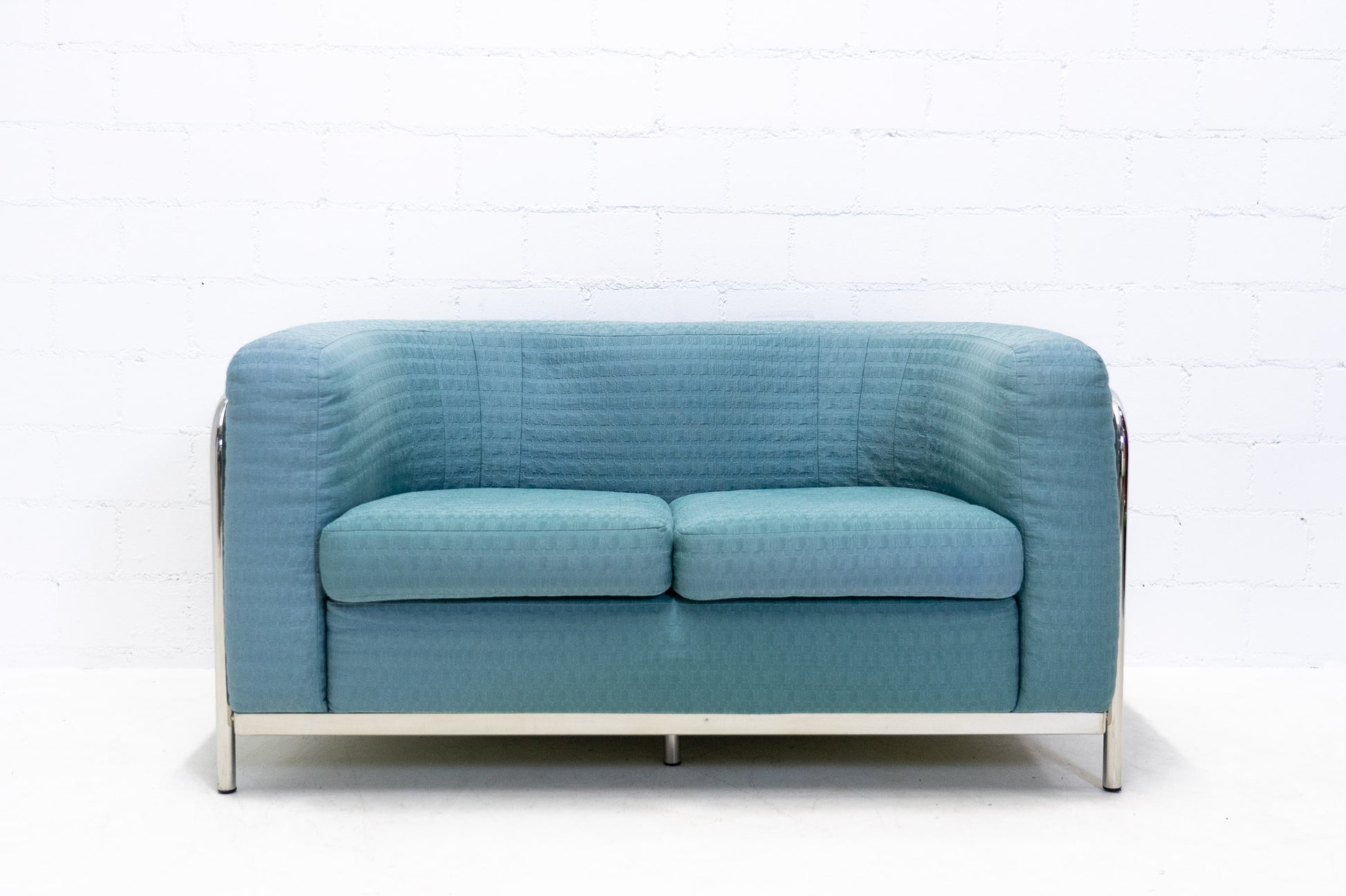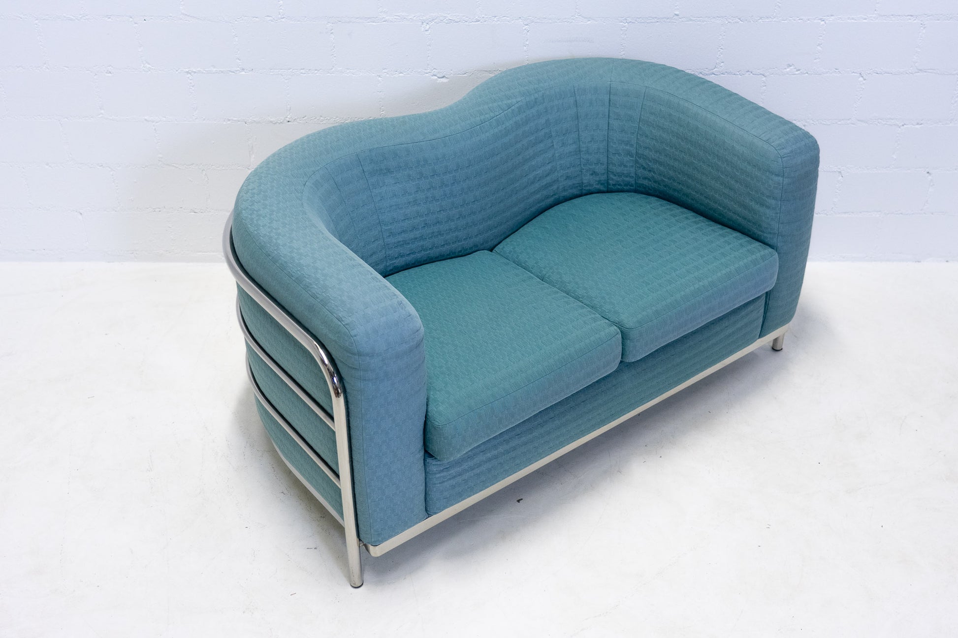 Das Sofa ist qualitativ sehr hochwertig gebaut. Der Stoff und das Gestell sind schön erhalten. Es hat leichte Gebrauchsspuren in Form von Kratzern, Abschürfungen und geringen Verfärbungen. Stellenweise hat es Aufhellungen im Stoff durch den Lichteinfall. Wir haben davon ein Detailfoto gemacht. Der Sitzkomfort ist sehr gut. Das Design stammt von Donato D'Urbino, Jonathan de Pas und Paolo Lomazzi. Der derzeitige Listenpreis für ein Sofa mit Leder liegt bei ca. 7400 CHF. Wir haben noch 2 passende Sessel, einen passenden Hocker und einen passenden Glastisch. Sie finden diese unter unseren weiteren Angeboten.